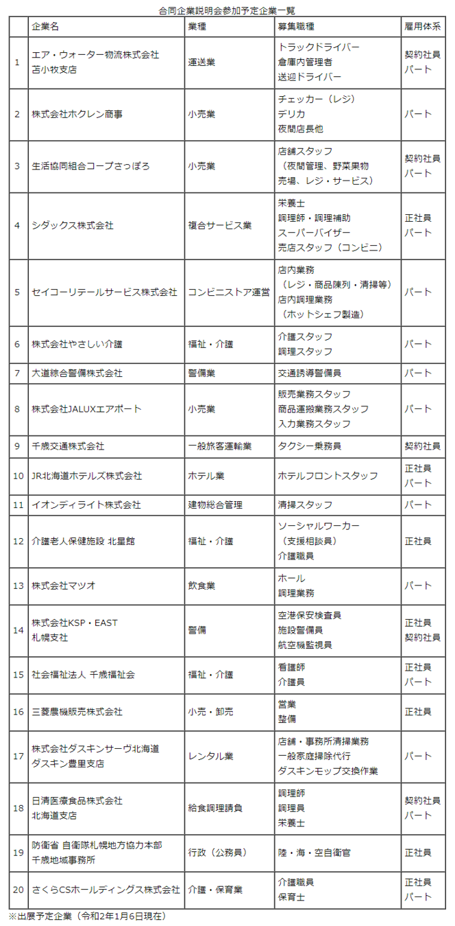 合同企業説明会には、千歳市内に事業所のある企業20社が出展します。