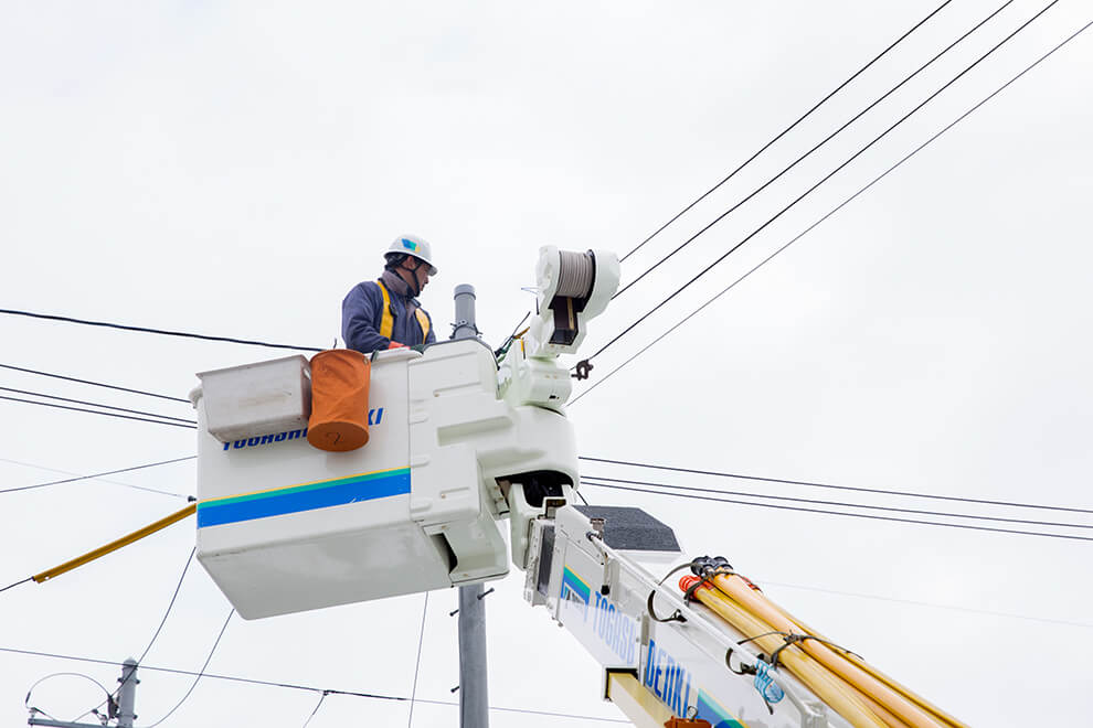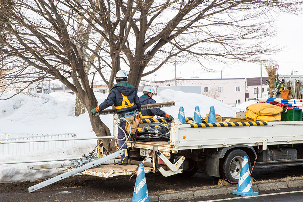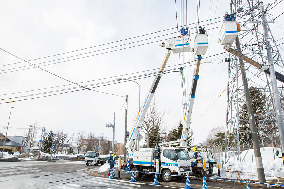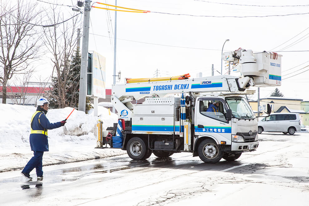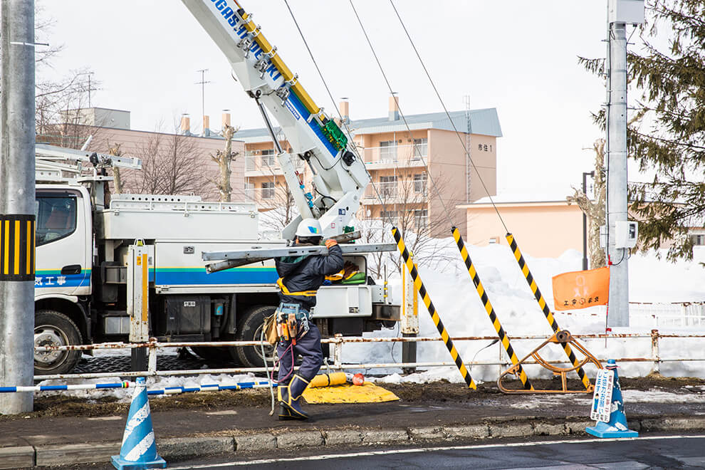 当社の主力を担う配電工事部門では、千歳市内唯一の北海道電力株式会社・北海電気工事株式会社の下請業者として、架線工事、建柱工事の受注・施工を請け負っており、千歳市内のほか、苫小牧や恵庭などの近郊地域で作業を行っています。