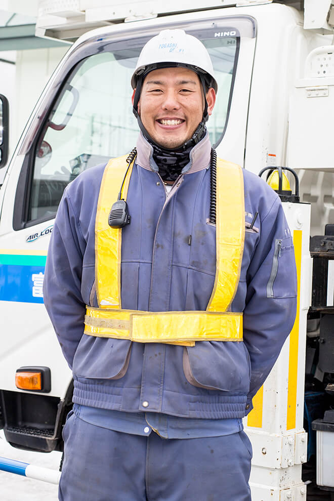 現在は主に高所作業車での柱上作業全般に携わっています。 それまで出来なかったことを自分なりに考え、工夫してこなせるようになった時や、自分で工程を組んで時間通りに作業を終えた時には達成感とやりがいを感じます。