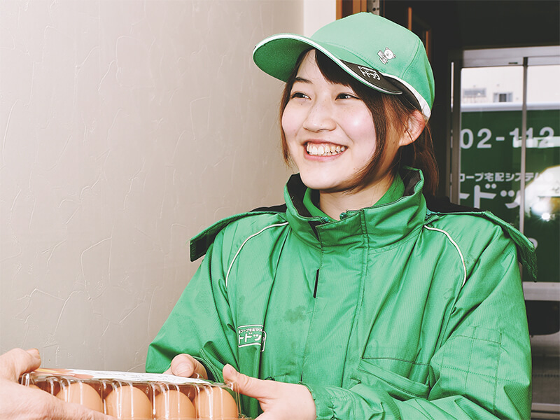 1日平均50件~80件のお宅に向け、ご注文いただいた食材や日用品「笑顔と一緒に」お届けします。毎週決まった曜日にお届けするので、組合員さんもあなたのことを待っていてくださいます。たくさんの笑顔に出会えるお仕事です。