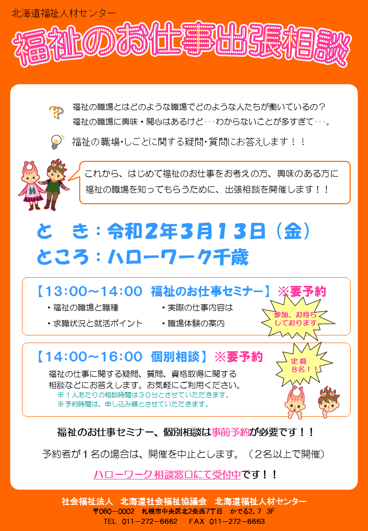 福祉のお仕事出張相談会 掲載日:2020.02.28 これから、はじめて福祉の仕事をお考えの方、興味のある方に福祉の職場を知ってもらうために、北海道福祉人材センターによる出張相談が開催されます。 【お知らせ】 新型コロナウイルス感染拡大が懸念される社会情勢を受け、予定されていた説明会、セミナーにつきまして、やむを得ず中止の措置を取る場合がありますので、あらかじめご了承ください。 福祉のお仕事出張相談 リーフレット