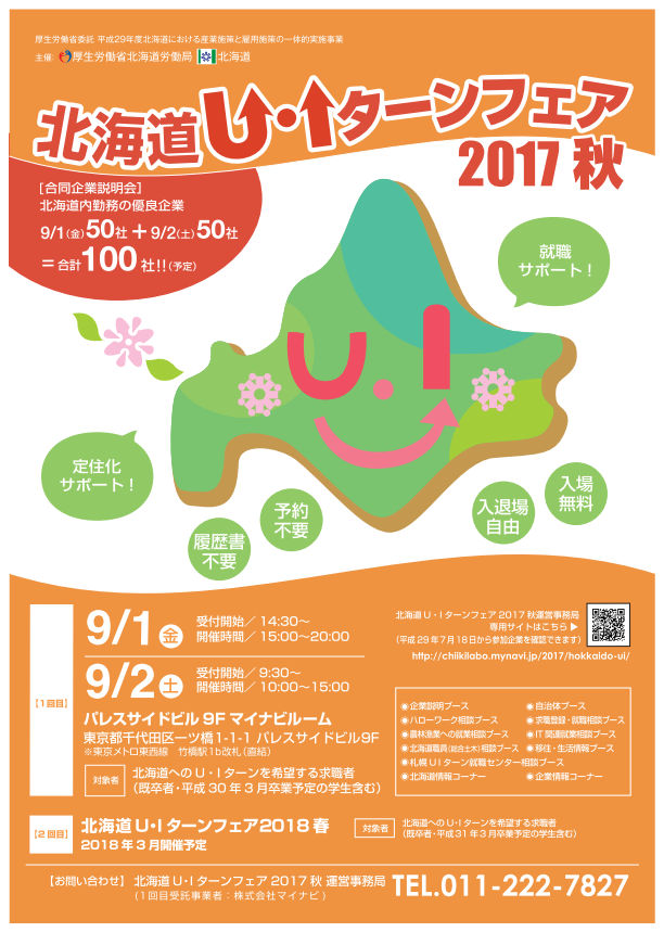 厚生労働省北海道労働局と北海道の共催で、北海道の企業に勤務を希望する方を対象にした合同企業説明会「北海道U・Iターンフェア2017秋」が平成29年9月1日(金)、2日(土)に東京都で開催されます。