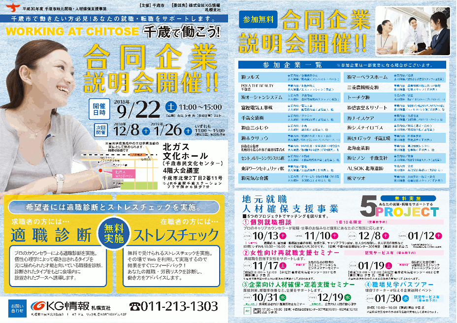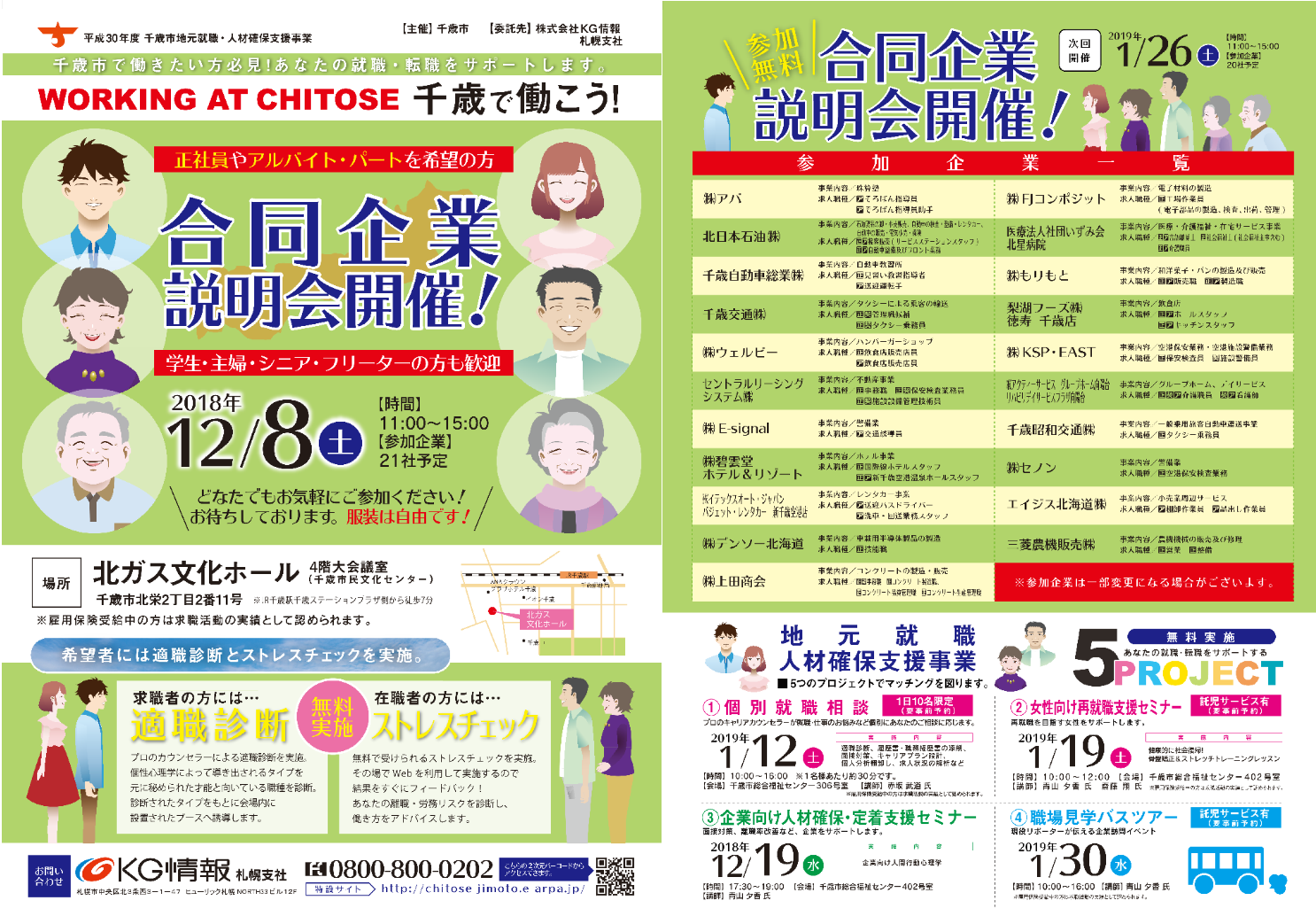千歳市では、地元就職・人材確保支援事業の一環として、第3回「合同企業説明会」を1月26日(土曜日)に開催します。