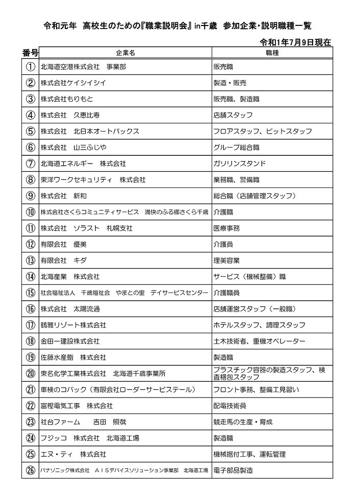 千歳市では、ハローワーク千歳との共催で、千歳市内の企業から高校生へ「職業」と「会社」を説明する合同企業説明会を開催します。