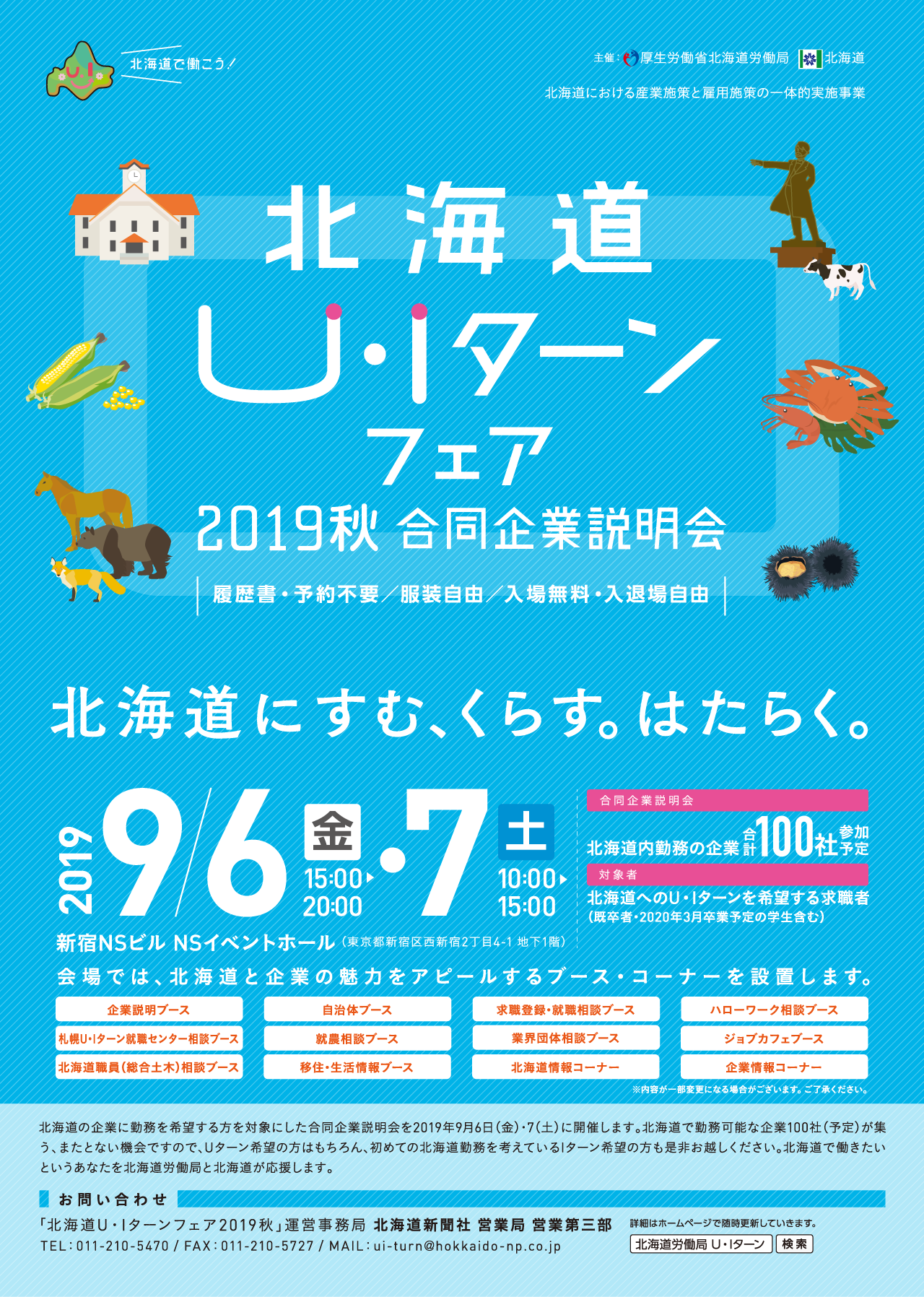厚生労働省北海道労働局と北海道の共催で、北海道の企業に勤務を希望する方を対象にした合同企業説明会「北海道U・Iターンフェア2019秋」が令和元年9月6日(金)、7日(土)に東京都で開催されます。