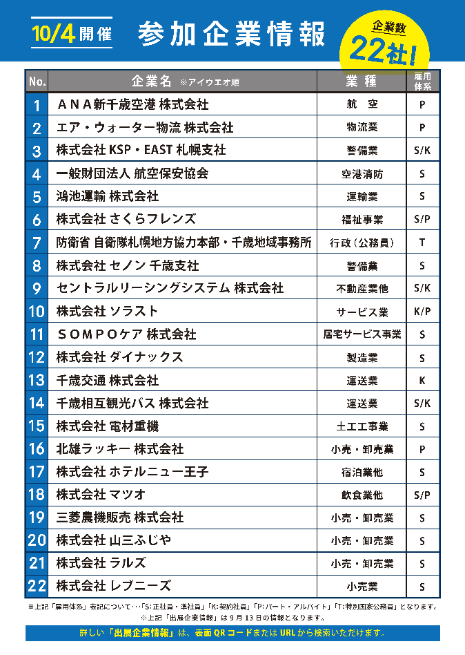 合同企業説明会には、千歳市内に事業所のある企業20社が出展します。