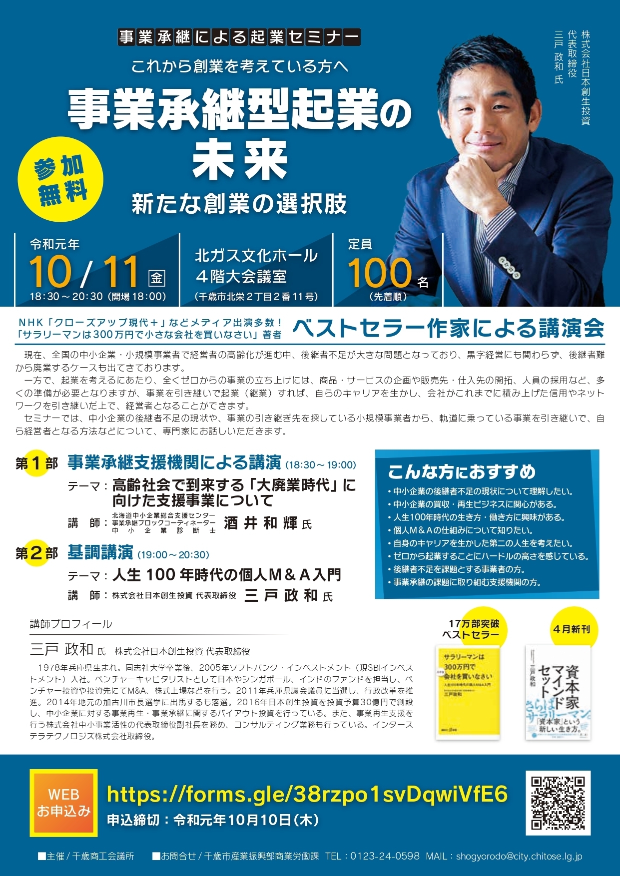 セミナーでは、事業承継支援機関より小規模事業者の後継者不足の現状についてお話しいただくほか、ベストセラー「サラリーマンは300万円で小さな会社を買いなさい」の著者であり、中小企業の事業承継や事業再生に詳しい、株式会社日本創生投資の三戸 政和さんをお招きし、後継者難等から事業の引き継ぎ先を探している小規模事業者から、軌道に乗っている事業を引き継いで、自ら経営者となる方法などについてお話しいただきます。