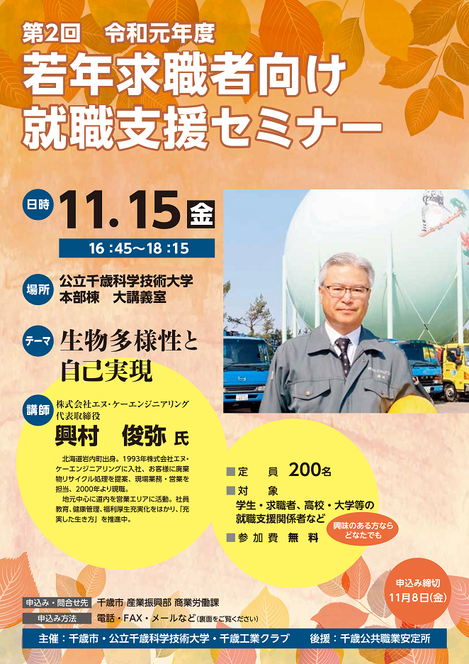 千歳市では、学生や若年求職者の職業観の醸成や就労意識の形成・向上を支援し、円滑な就職及び職場定着を促進するため、千歳科学技術大学との連携により、若年求職者向け就職支援セミナーを開催します。