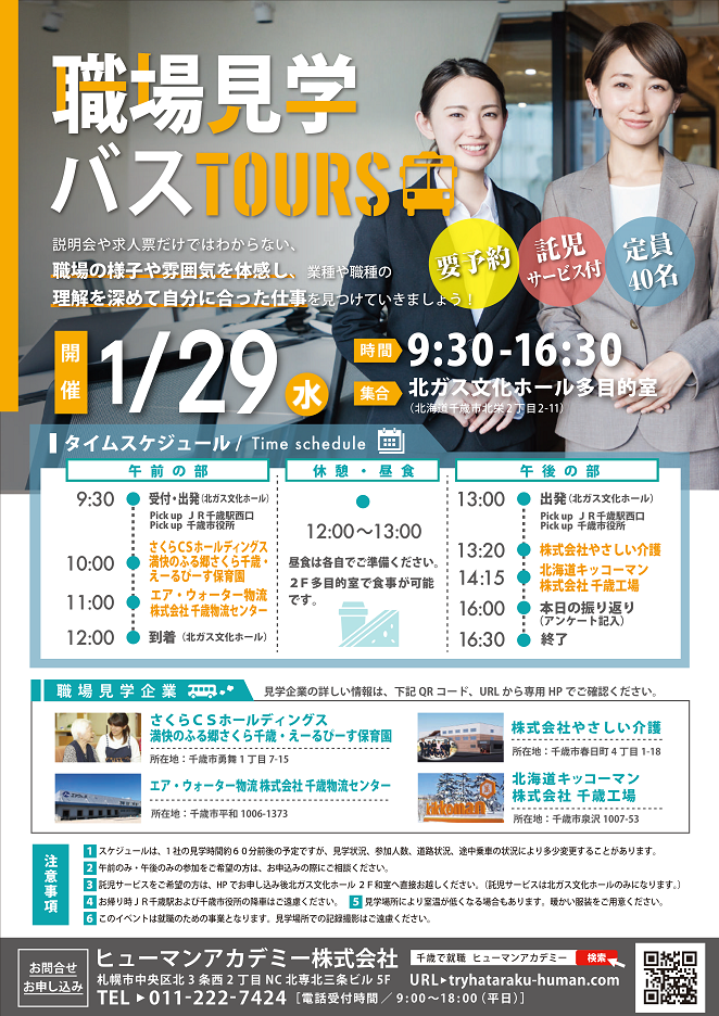千歳市では、地元就職・人材確保支援事業の一環として、「職場見学バスツアー」を1月29日(水曜日)に開催します。