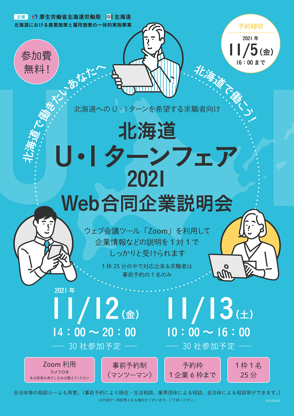 厚生労働省北海道労働局と北海道の共催で、北海道の企業に勤務を希望する方を対象にした「北海道U・Iターンフェア2021WEB合同企業説明会」が令和3年11月12日(金)、13日(土)に開催されます。