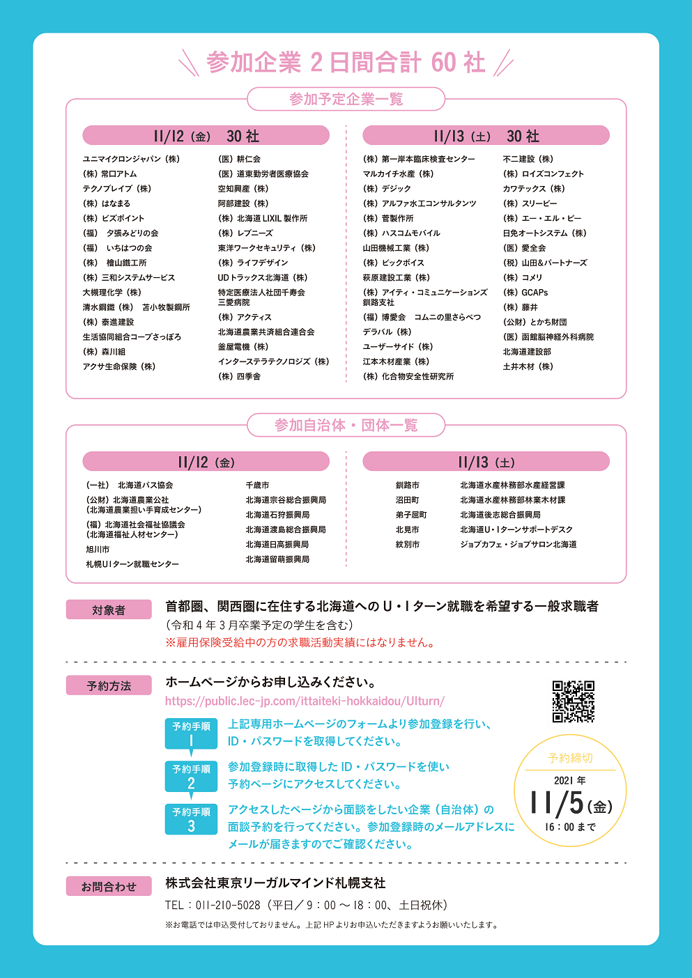 北海道で勤務可能な60社(2日間合計・予定)の出展を予定するほか、自治体ルームには千歳市も参加しますので、Uターン希望の方はもちろん、北海道へ移住を考えている方、初めて北海道勤務を考えているIターン希望の方も是非ご利用ください。