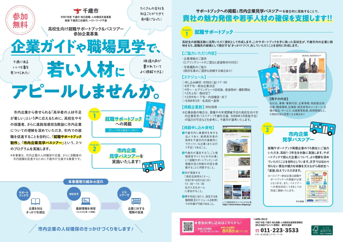 ※応募多数の場合は、業種や今年度開催予定の高校生向け市内企業見学バスツアー(千歳市主催、令和8年3月実施予定)の協力の可否などを参考に、千歳市が選考いたします。