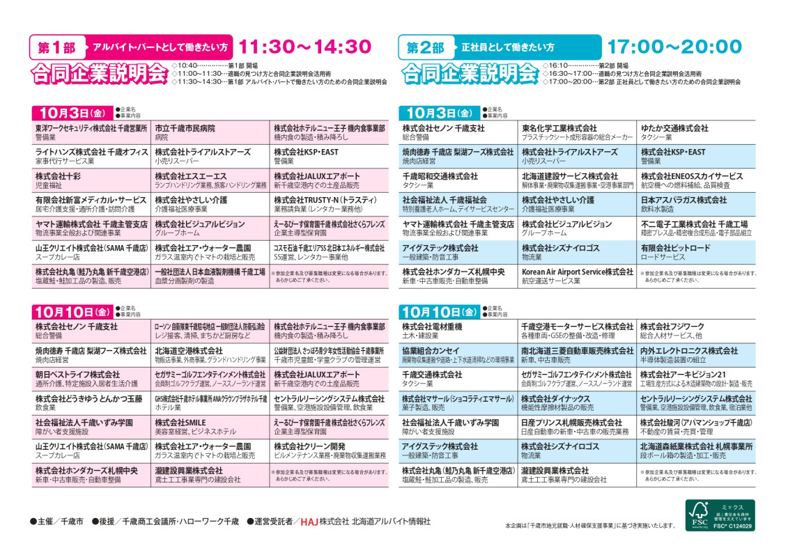 【第1部】東洋ワークセキュリティ(株)千歳営業所 、(株)やさしい介護、ライトハンズ(株) 千歳オフィス、(株)ビジュアルビジョン、(株)十彩 、(株)エア・ウォーター農園、(有)新富メディカル・サービス 、(一社)日本血液製剤機構 千歳工場、ヤマト運輸(株) 千歳主管支店 、(株)ホテルニュー王子機内食事業部、山王クリエイト(株)(SAMA千歳店)、 (株)KSP・EAST、(株)丸亀 (鮭乃丸亀新千歳空港店) 、(株)JALUXエアポート、市立千歳市民病院 、(株)TRUSTY-N、(株)トライアルストアーズ、えーるぴーす保育園千歳 (株)さくらフレンズ、(株)エスエーエス、コスモ石油千歳エリアSS 北日本エネルギー(株)
