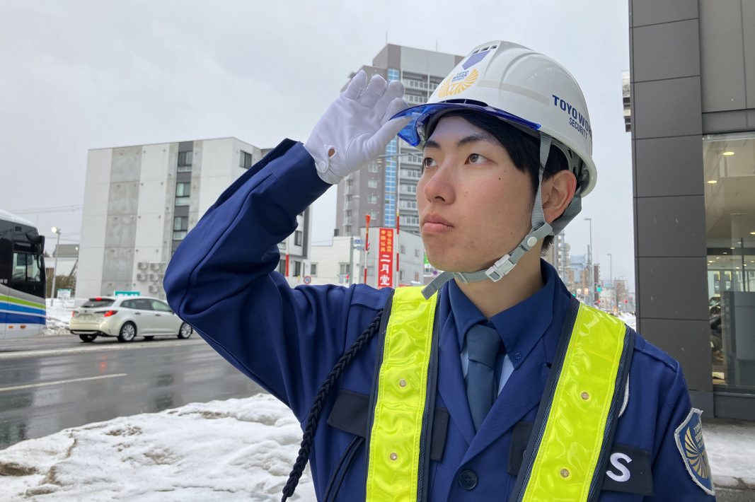 千歳営業所の主な業務は、工場新築現場や道路の工事現場等で車や自転車、歩行者を安全に誘導する「交通誘導」と、千歳、恵庭にある工場の出入管理を行う「施設警備」の2つになります。