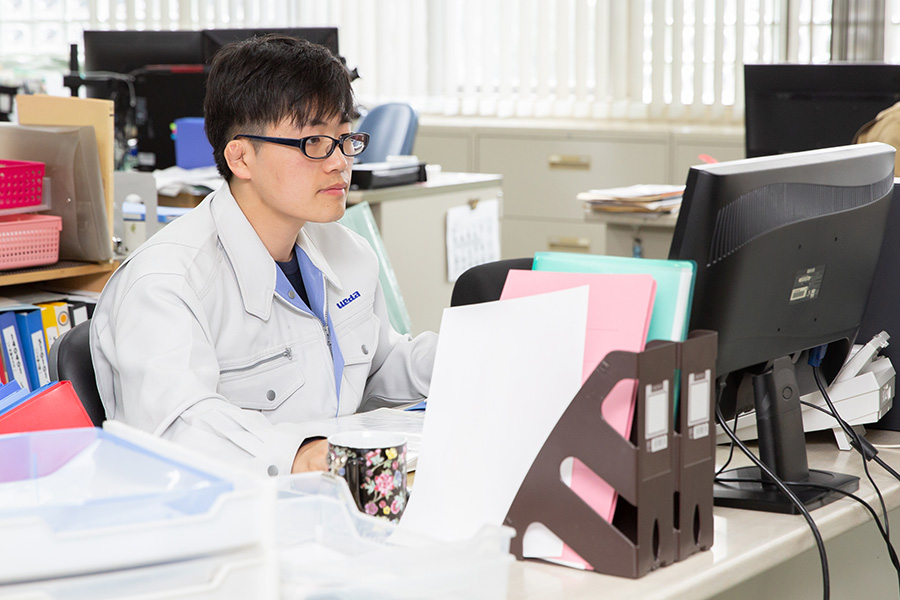 自社の製品が生活の基盤を支えていると感じる 設計や図面を書くことが好きだったので専門学校を卒業した後、上田商会に入社しました。入社して22年になります。