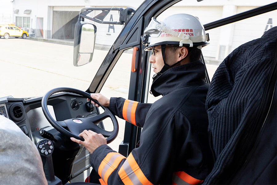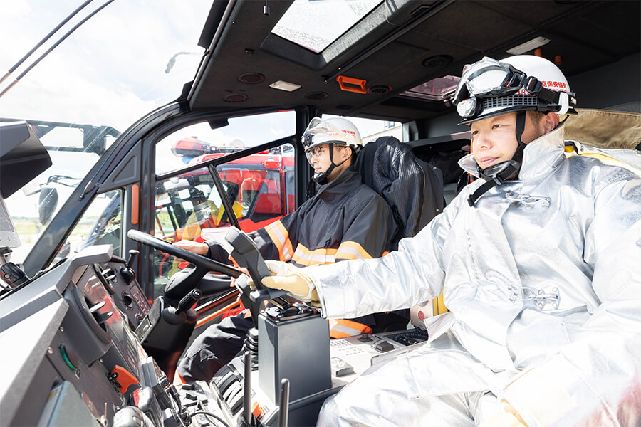 空港および空港周辺における航空機事故発生時の消火・救難業務に関する仕事です。大型化学消防車およびフルトレーラーの運転操作を伴うため、大型、けん引免許が必要となります。