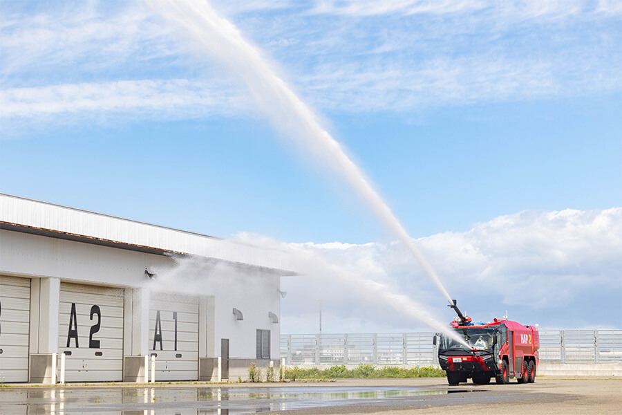 万が一空港内で航空機事故が発生した場合は、管制塔からの通報に応じてただちに駆けつけ、消火救難活動を開始します。事故現場に到着するまでの時間は国際標準で3分以内とされており、普段から有事の際に迅速かつ適切に行動できるよう、訓練や消防車両などの点検を行っています。