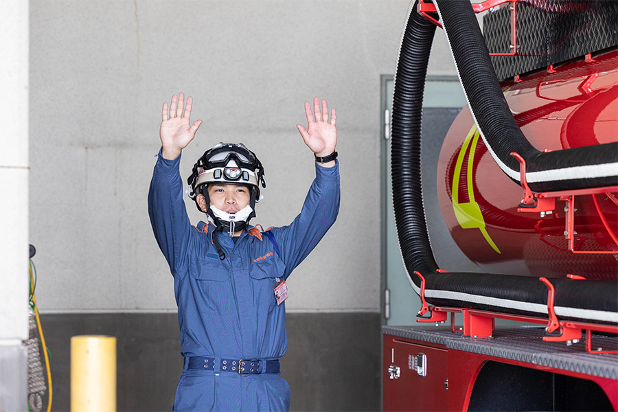 働く職員の前職は様々で、自衛官や自治体の消防士のほか、バスやトラックの運転士だった方もおり、消防業務未経験で入社された方も多くいますが、訓練や座学、機材の点検等の日常業務の中で空港消防として必要な専門知識や技能の習得が可能です。