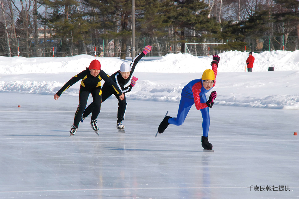 千歳市の小学校では冬の体育の授業でスピードスケートを学びます。リンクはグラウンドの雪を踏み固めて水を撒いた手作りです。千歳のスケートリンクでスケートに出会い、オリンピックに出場した選手もいます。