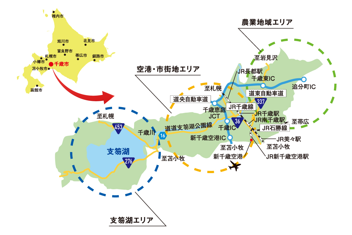 西部は、支笏洞爺国立公園の豊かな自然に囲まれた「支笏湖エリア」、中央は、新千歳空港、工業団地、商業地や住宅地などの「空港・市街地エリア」、東部は、牧場や農園などの「農業地域エリア」の3エリアに分かれています。