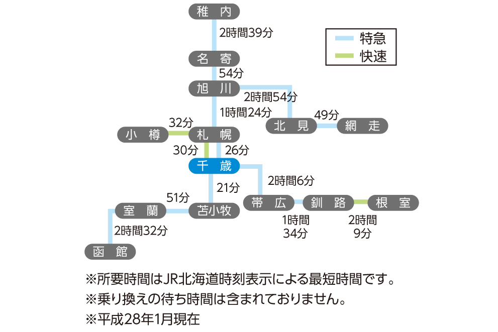 道内最大の幹線道路が集中する千歳市は、札幌と室蘭を結ぶ国道36号、道央圏の幹線道路につながる国道337号があり、また道央自動車道と道東自動車道の結節点に位置しているため、道内の主要都市や観光地、スキー場等への移動がとても便利です。